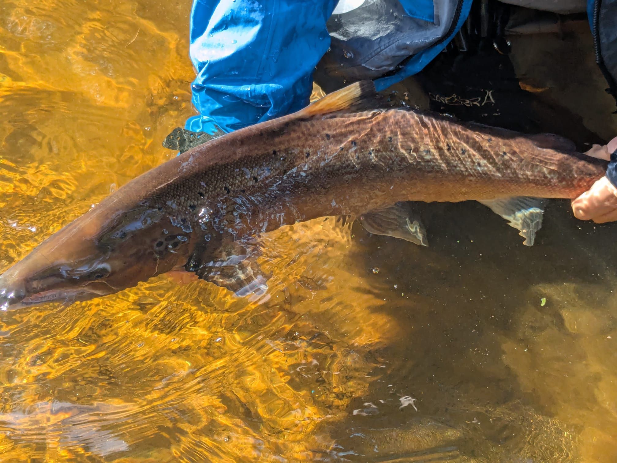 Fly: Silver bodied, red tailed, orange muddler. Size 10.